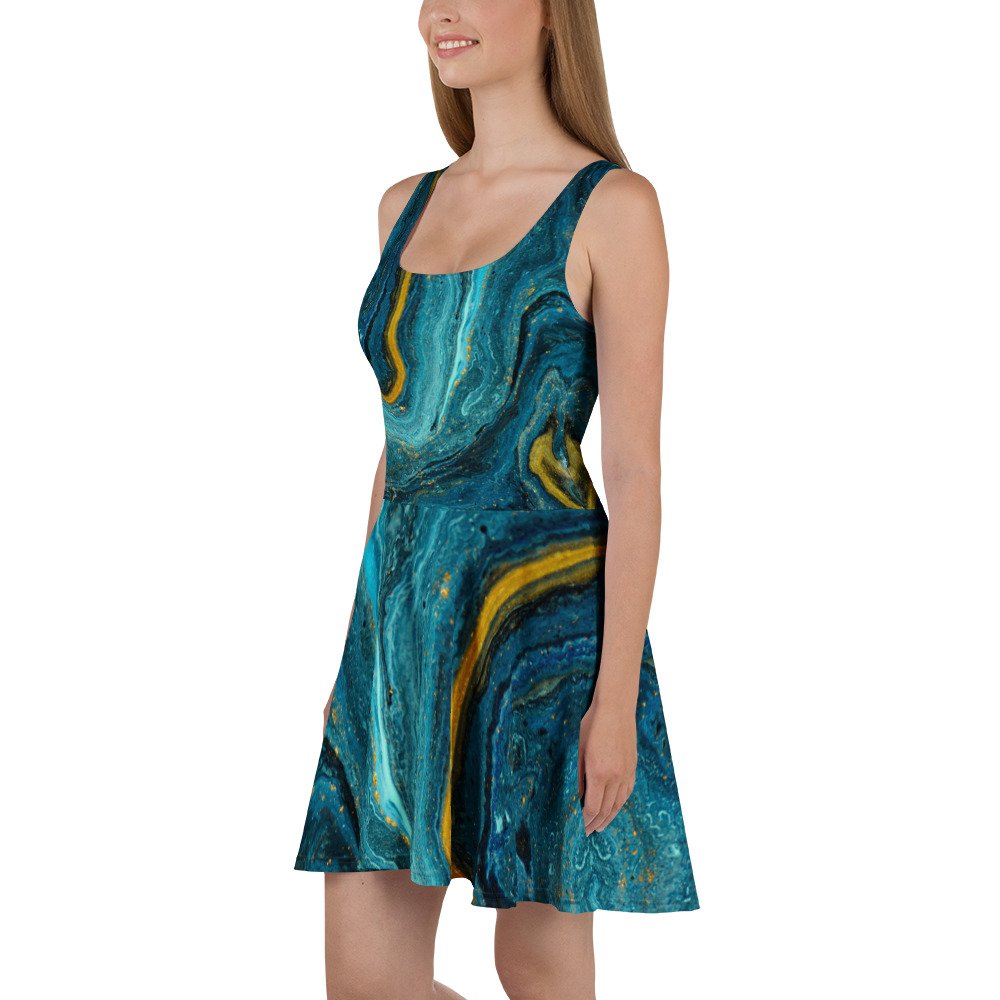 Step into the spotlight with the Gold Striped Marble Dress, designed to captivate attention and exude confidence. This stunning dress is perfect for special occasions, evening gatherings, or simply when you want to make a bold fashion statement. In fact, its unique design and high-quality craftsmanship ensure that you’ll stand out wherever you go. Moreover, its cosmic-inspired charm adds a touch of mystery and elegance to your wardrobe.